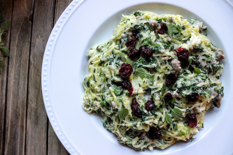 This spaghetti squash has a fall twist and is mixed with Italian sausage, spinach, thyme and a goat cheese cream sauce. To add some balance to the dish, I added some sweet dried cranberries on top.