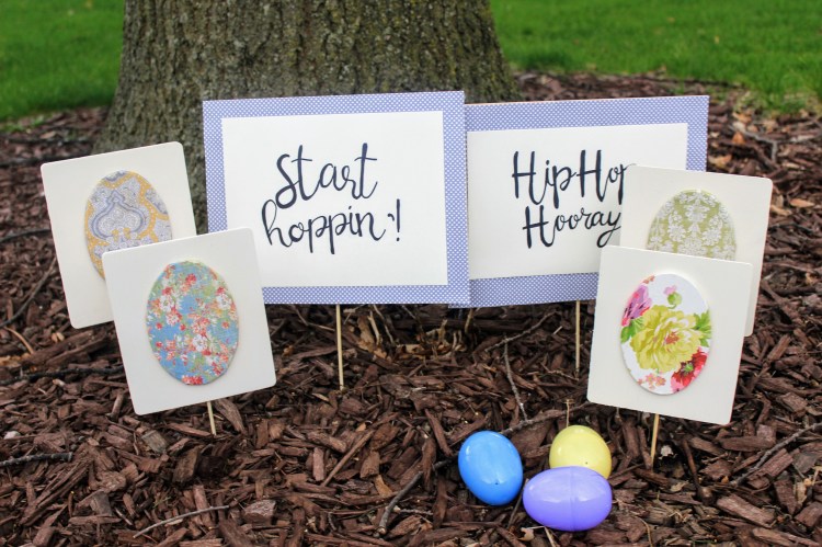 Making my own really was simple (didn’t take more than an hour or two, which can totally be done during nap time), and I mean it when I say that. I painted a couple of wood boards, glued some scrapbook paper and attached BBQ skewers to each of my “signs” to allow them to stick in the ground. In addition to start and finish signs, I created signs with eggs (oval shapes) to mark where we’d place the eggs.