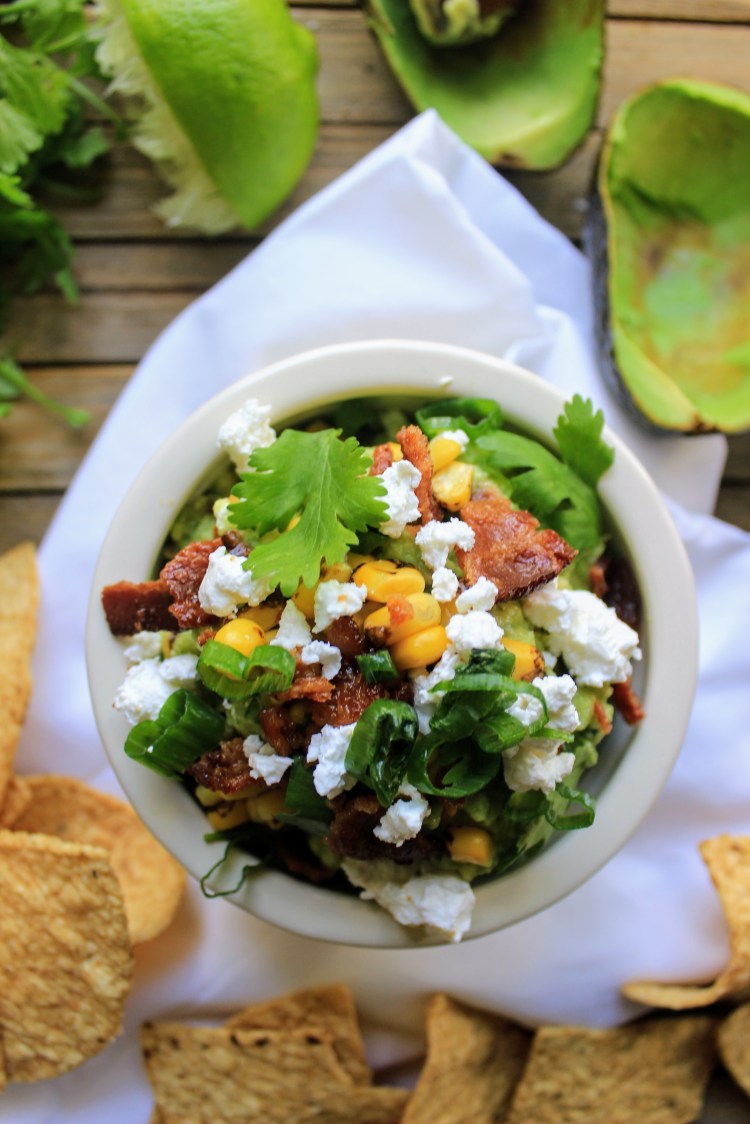 This week, I wanted to try a savory, loaded guacamole. I aimed to make something drool-worthy, something my husband and I couldn’t put down. Based on the amount of chips we consumed, and the time it took us to finish (embarrassing!), I think it’s safe to say this holy guacamole loaded with bacon, sweet roasted corn, feta, green onion, cilantro and lime was a success. It sounds like a lot, but it’s so easy and it’s FUN! Perfect for your Cinco de Mayo party or as a snack to celebrate the holiday this Friday.