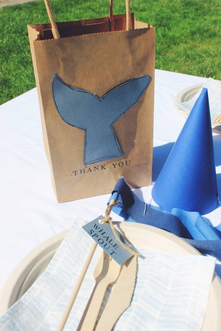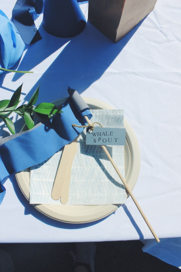 Emory’s little friends got goody bags that I glued whale tales to and stamped “thank you” on. To be honest, it’s been so long that I forget what I put in them. I think I put some bubbles and whale bath toys in there, but I can’t remember! We also made little whale spouts (fabric pieces tied to round wooden sticks) that his friends could play with during the party.