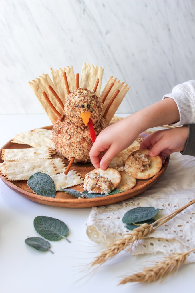 Anyways… back to the turkey cheeseball! This idea came to me randomly when I was trying to think of cute Thanksgiving recipes to make for the kids (and then hopefully post them on the blog) and initially my head went straight to mini turkey cheeseballs for each kid. I figured it would make a cute lunch and lately the kids have loved when I throw a bunch of crackers, cheese, fruit, hummus, etc. on a plate, so I thought mini cheeseballs would be right up their alley. Instead, I decided to go with the big mama turkey.