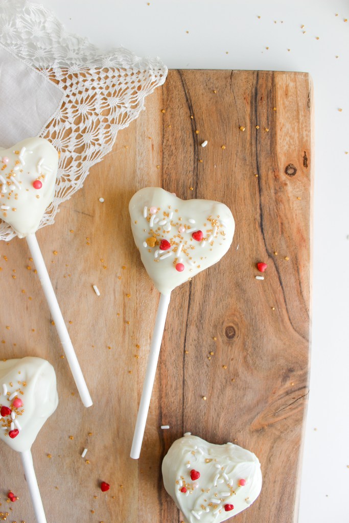 Working in golf ball-size portions of the cake mixture, mush the cake together and form hearts. Place a cake pop stick at the bottoms of the hearts and place them on a baking sheet of plate. When you’re done forming the cake pops, place them in the freezer to harden for 30 minutes.