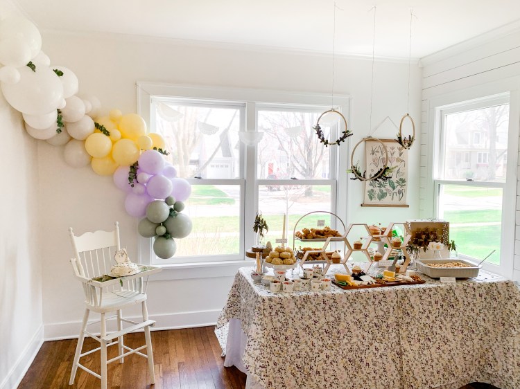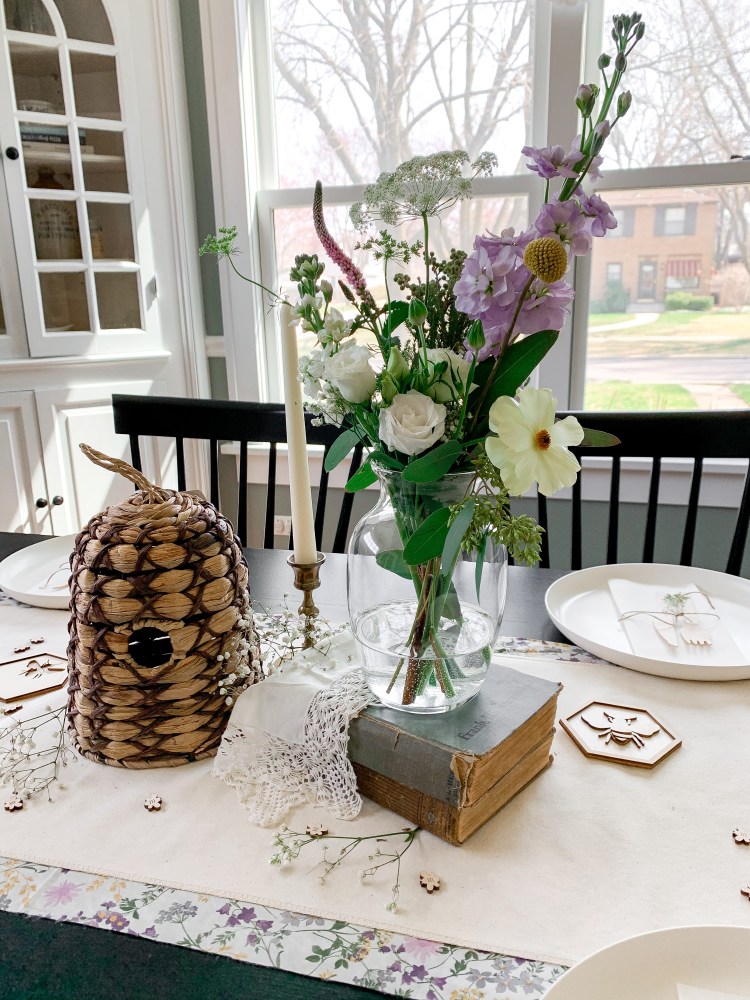 Throughout the house, I had vases filled with wildflowers I handpicked from local shop, Andrew’s Garden, light wood bee decorations, and lots of eucalyptus and baby’s breath. I wanted everything to feel light and airy, and I used antique books and candle holders to give it a bit of a romantic vibe.