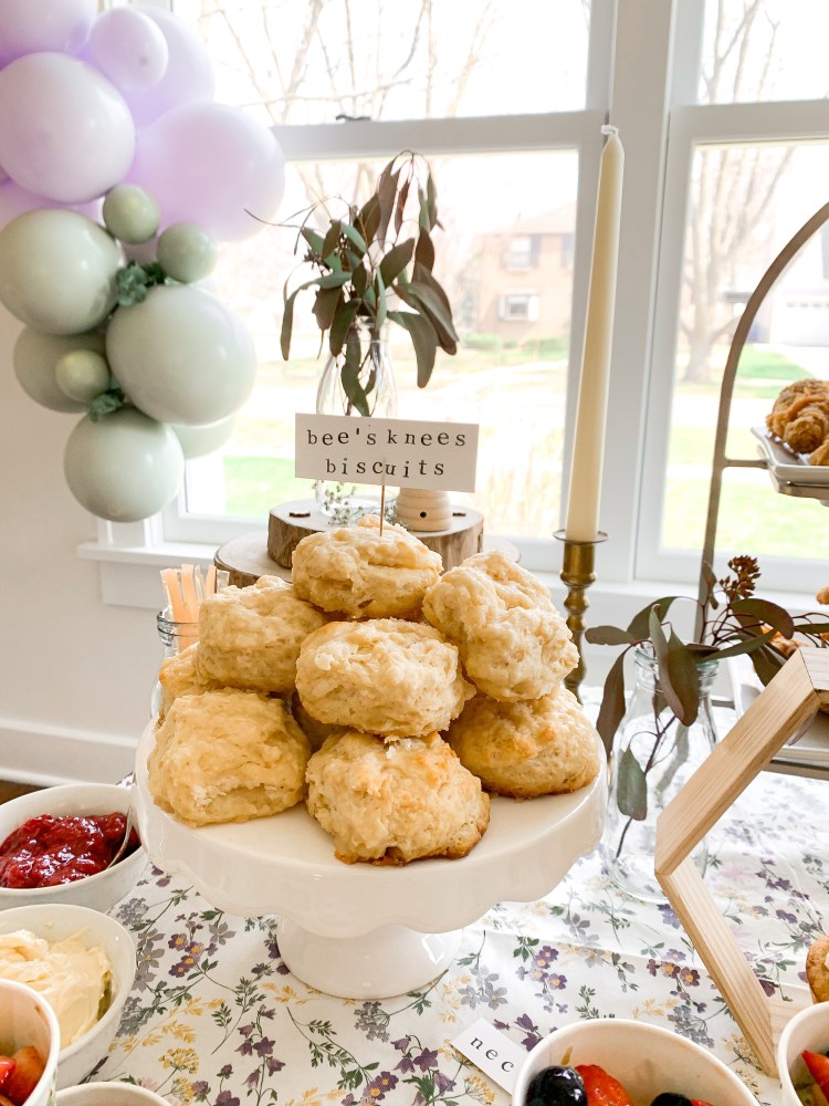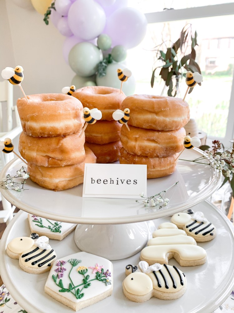 Another fun element was putting the menu together. The kids enjoyed helping me come up with names for our food. We feasted on bee’s knees biscuits, nectar cups (fruit salad), forager fried chicken, a queen bee’s cheeseboard, pollinator mac and cheese, and a strawberry field salad. For dessert, I purchased cookies from a local woman (White Marble Bakery), made honey cupcakes and stacked store-bought glazed donuts to make “beehives”. My husband made the wood hexagon cupcake holder and it turned out perfectly.