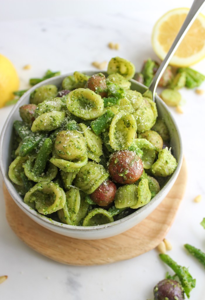Drain the pasta, place it back in the pot and add the seasoned potatoes and green beans. Stir everything together and add the pesto. Add the pasta water a little at a time (don’t feel like you need to use it all) and stir to create the perfect creamy sauce.